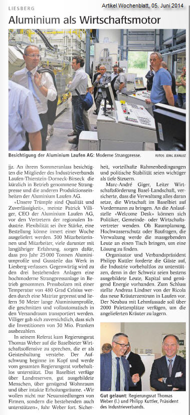 Der 1. Sommeranlass des Industrieverbands fand am 3. Juni 2014 in der Aluminium Laufen AG in Liesberg statt.